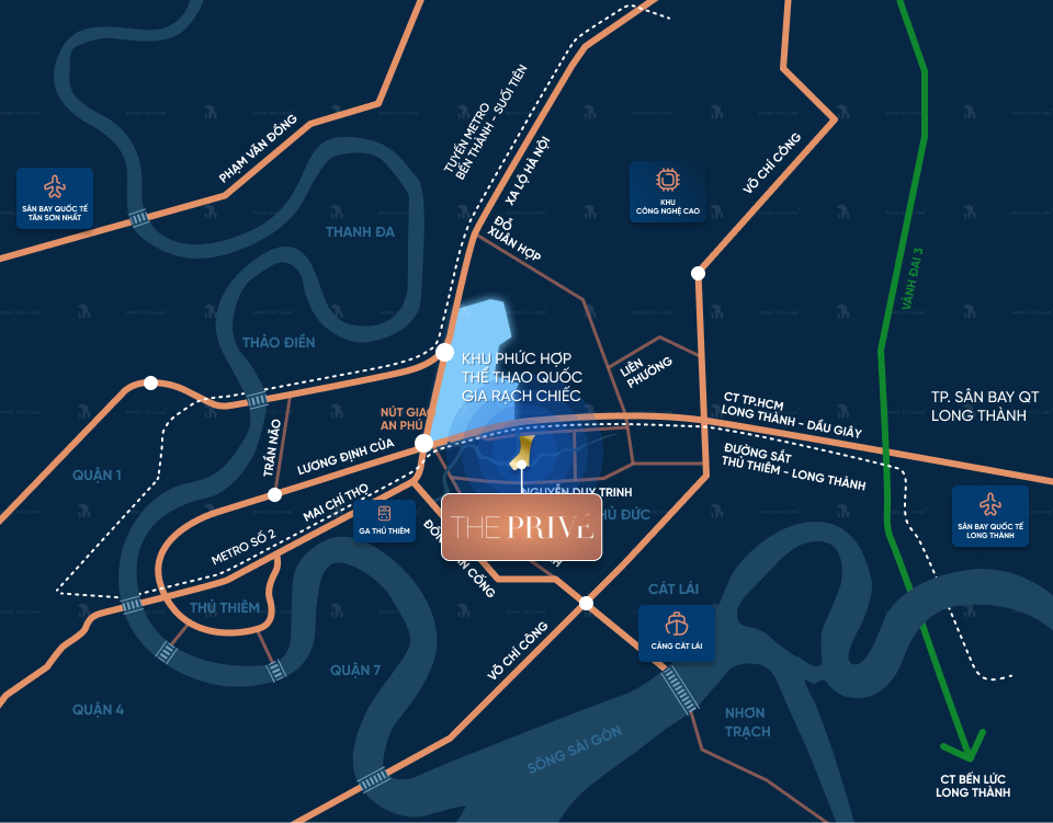 The Privé sở hữu vị trí đắc địa, nằm ngay “cửa ngõ” của nút giao An Phú – một trung tâm giao thông chiến lược kết nối Cao tốc TP.HCM – Long Thành – Dầu Giây, Đại lộ Mai Chí Thọ và Lương Định Của.
