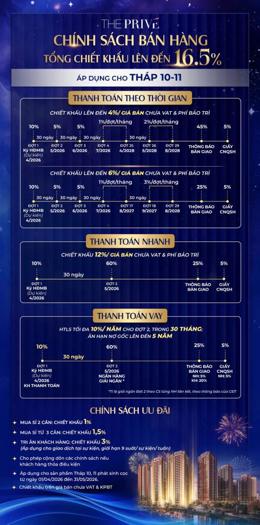 Đây cũng là lý do The Privé trở thành tâm điểm bất động sản khi đáp ứng đúng nhu cầu của khách hàng muốn sở hữu “nhà sang” ngay trung tâm Sài Gòn với mức giá tốt – chỉ từ 130 triệu/m² (khoảng 8,9 tỷ/căn), bàn giao hoàn thiện nội thất cao cấp.